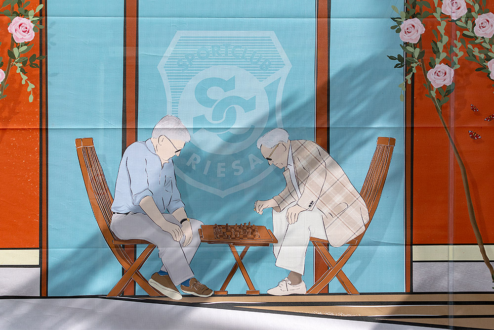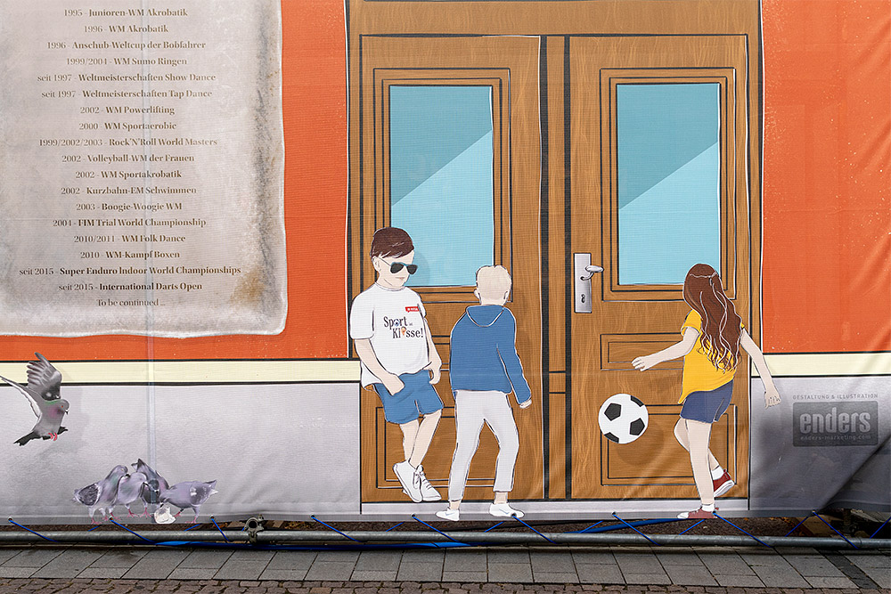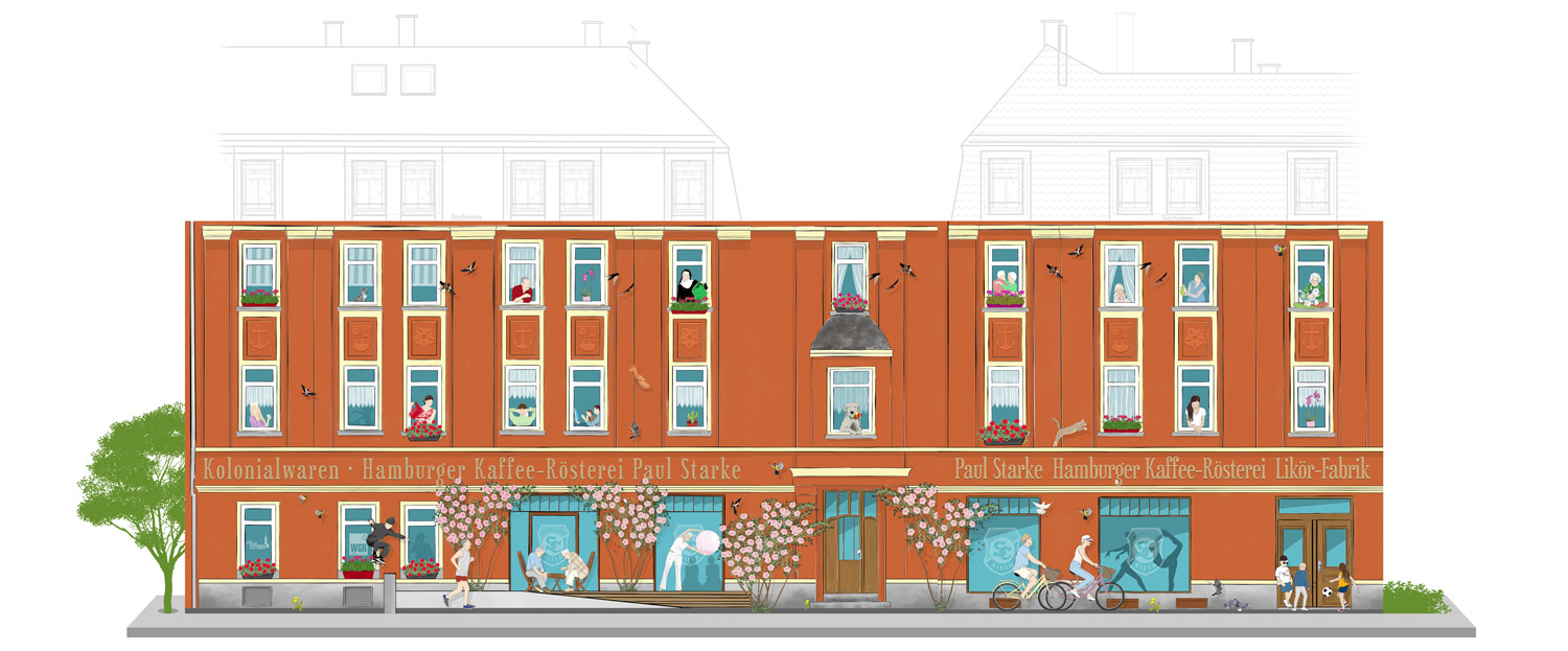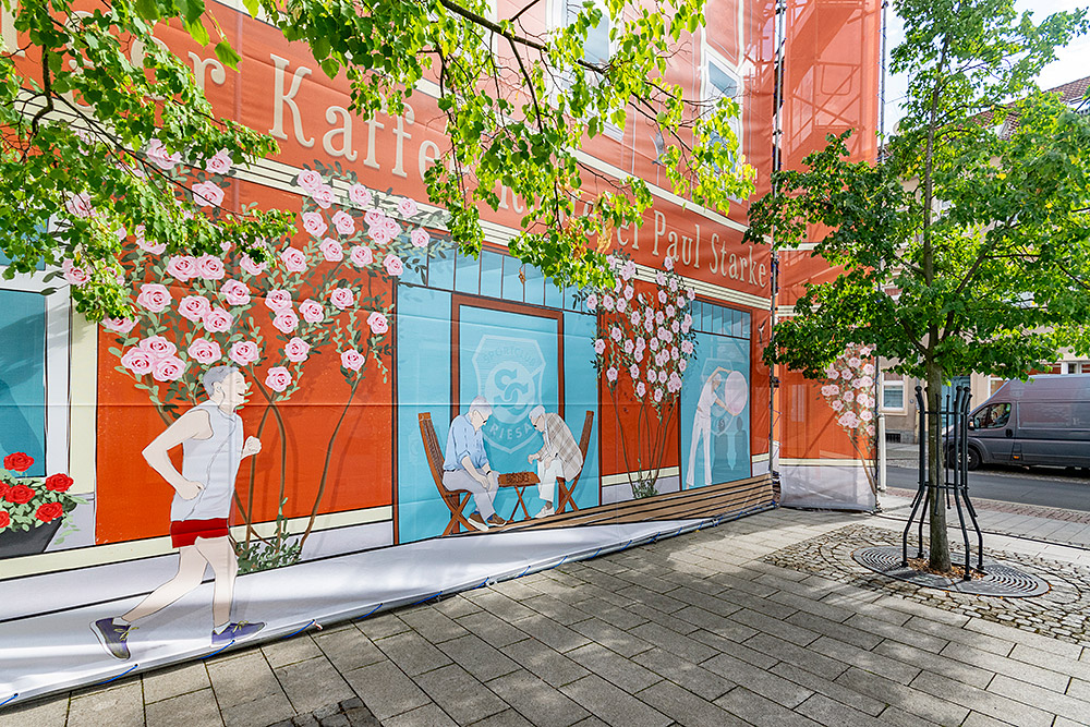 Weil die Plane so groß ist, mussten wir die gesamte Illustration wie ein Puzzle aufteilen – jede Seite besteht aus vier Teilen, ergibt aber ein unverwechselbares Gesamtbild. Wo sich einst echte Fenster, Türen und historische Schriftzüge befanden, sind es nun illustrierte, die von Szenen aus dem Alltag geschmückt werden.
