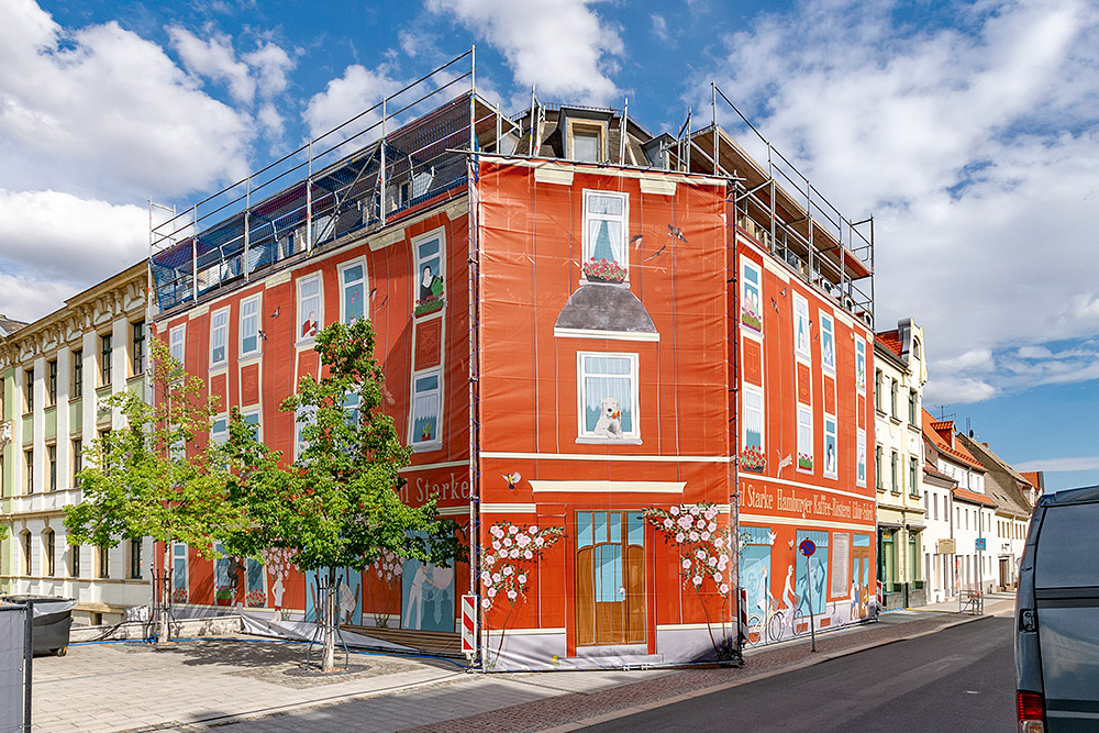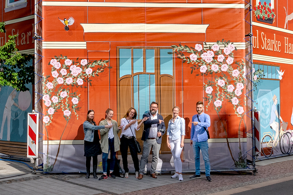 Die Bauplane mit ihren vielen verspielten Details hat der WGR Riesa große Aufmerksamkeit beschert und den Standort im Zentrum verschönert. Den erstaunten Passanten erlaubt sie einen kleinen Blick in die Zukunft – in den oberen Etagen des geschichtsträchtigen Hauses sollen schöne Mietwohnungen entstehen.