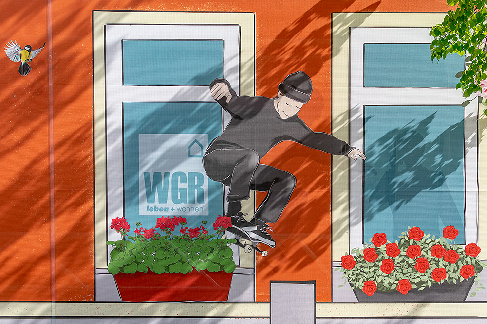 Jedes Wohnungsunternehmen kennt das Problem, fast jedes hat es: Unsanierte Häuser, die keinen schönen Anblick bieten, besonders nicht in der Sanierungsphase. Die WGR Riesa wollte sich damit nicht zufriedengeben und beauftragte uns, eine Bauplane für das Eckhaus am Rathausplatz in Riesa zu entwerfen. Ziel des Projekts war es nicht nur, die Hausfassade mit Illustrationen zu verschönern, man wollte auch Neugier der Passanten wecken. Was entsteht hier? Wer zieht hier ein?
